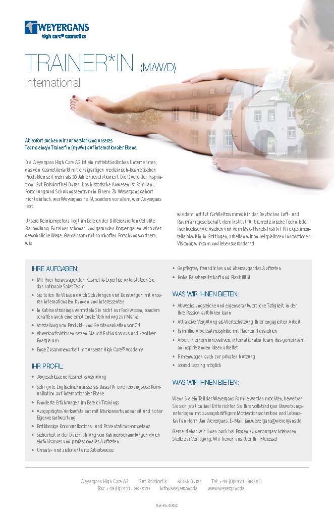 Richten Sie Ihre vollständigen Bewerbungsunterlagen bitte an Jan Weyergans (jan.weyergans@weyergans.de) oder rufen Sie für einen Erstkontakt gerne an: 0172 – 9003008 (Rudolf Weyergans). Sperrvermerke werden selbstverständlich beachtet.